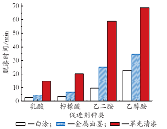 促進劑能與主溶劑結合產生協同效應,增大麻豆下载网站在有機塗層中的擴散速率,提高漆膜的溶脹、起皺能力,從而提高脫漆效率。為有效控製鍍錫鋼板的腐蝕程度,本試驗分別選取酸度較小的乳酸、檸檬酸,及乙二胺、乙醇胺這2種堿性溶劑作為麻豆下载网站的促進劑。麻豆下载网站其他組分保持不變,溫度恒定為60℃,試驗結果見圖1。
